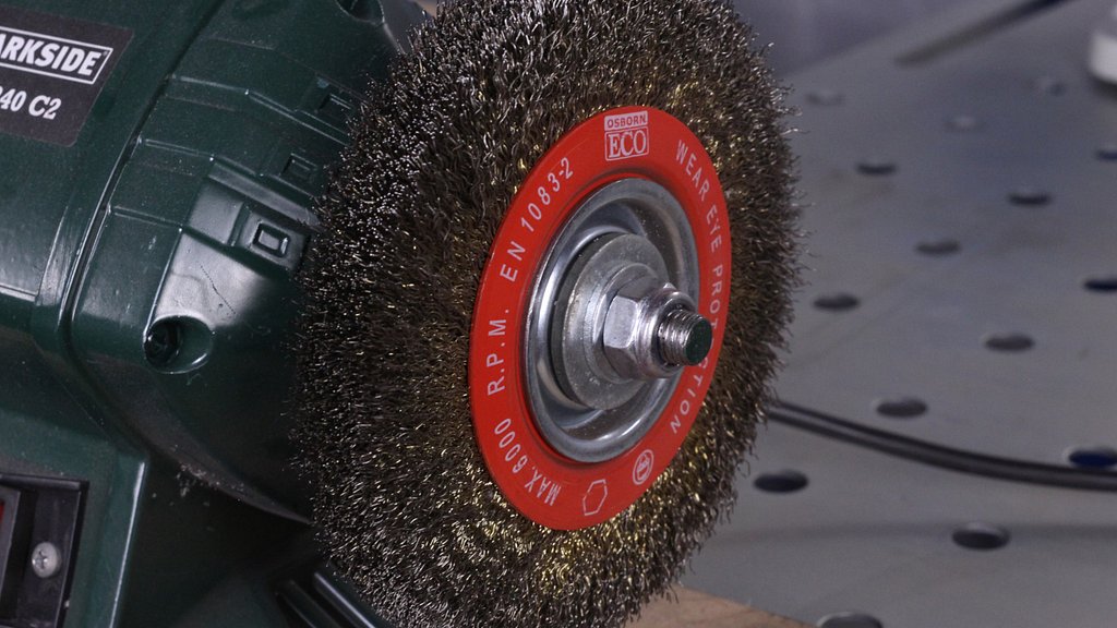 Safety note: while these can be extremely useful, they can also be dangerous. If you present a corner of a part to the wheel at the wrong angle, it can grab the piece and kick it back, potentially taking your hands with it. Be very careful when using spinning tools and always wear safety glasses. A safer method is media blasting in a proper blasting cabinet.